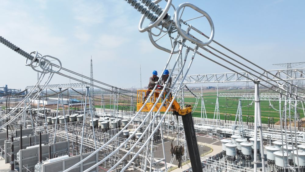 在施工現場,天津送變電公司員工進行1000千伏引線間隔棒安裝工作。新華社發